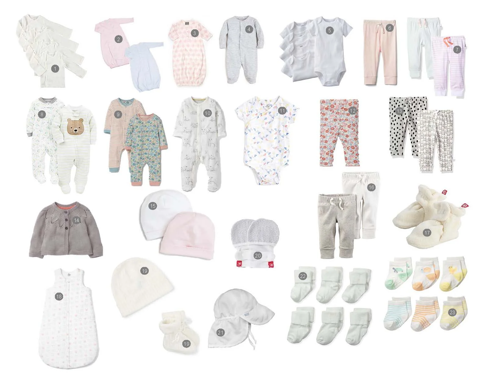 1. Carter’s Newborn T-shirts ǀ 2. Kissy Kissy Convertible Gowns ǀ 3. Kate Quinn Infant Sacque ǀ 4. Kissy Kissy Striped Footie ǀ 5. Carter’s Bodysuits ǀ 6. Burt’s Bees Organic Quilted Cotton Pants ǀ 7. Burt’s Bees Organic Jogger 2-Pack ǀ 8. Carter’s Sleep and Play Onesies ǀ 9. Boden Romper Twin Pack ǀ 10. Boden Lamb Sleepsuit ǀ 11. Aden and Anais Kimono Bodysuit ǀ 12. Boden Baby Leggings ǀ 13. Rosie Pope Pants ǀ 14. Boden Cosy Cardigan ǀ 15. Kissy Kissy Hat 2 Pack ǀ 16. Carter’s Baby Pants ǀ 17. Zutano Booties ǀ 18. Baby Gap Sleep Bag ǀ 19. Ralph Lauren Cashmere Hat and Booties Set ǀ 20. Goumikids Scratch Mittens ǀ 21. iplay Sun Hat ǀ 22. Jefferies Newborn Cuff Socks ǀ 23. Carter’s Newborn Animal Socks